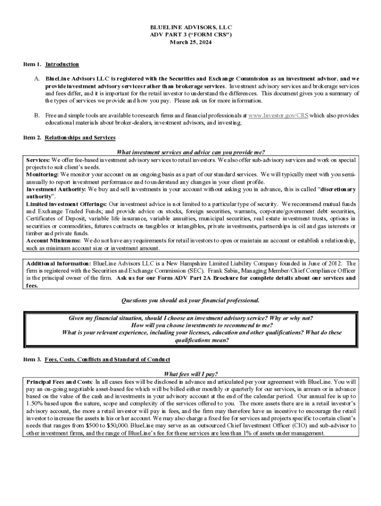 Get the free BLUELINE ADVISORS, LLC ADV PART 3 (FORM CRS") March 25 ...