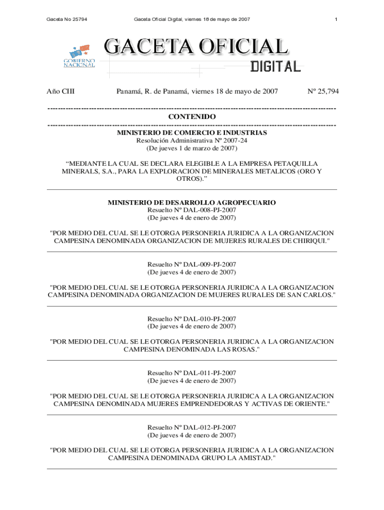Gaeta No 25794Ao CIIIGaceta Official Digital, earned 18 DE mayo de 2007Panam, R. de Panama, earned 18 DE mayo de 20071 N 25,794CONTENIDO