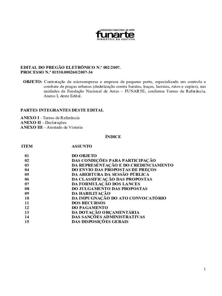 EDITAL DO PREGO ELETRNICO N. 002/2007. PROCESSO N. 01530.000260/200734 OBJETO: Contratao de microempresa e empresa de pequeno porte, especializada em controle e combate de pragas urbanas (dedetizao