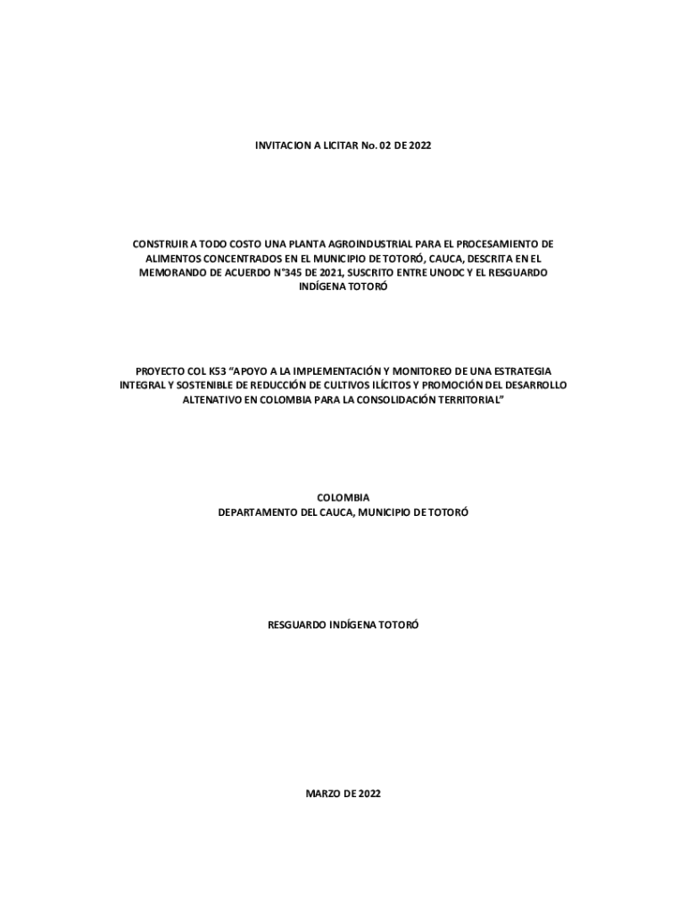INVITATION A LICIT AR No. 02 DE 2022CONSTRUIR A To-do COST RNA PLANTA AGRO-INDUSTRIAL PARA EL PROCESAMIENTO DE