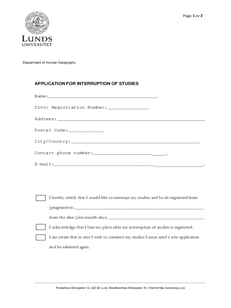 Page 1 av 2Department of Human GeographyAPPLICATION FOR INTERRUPTION OF STUDIESName:___