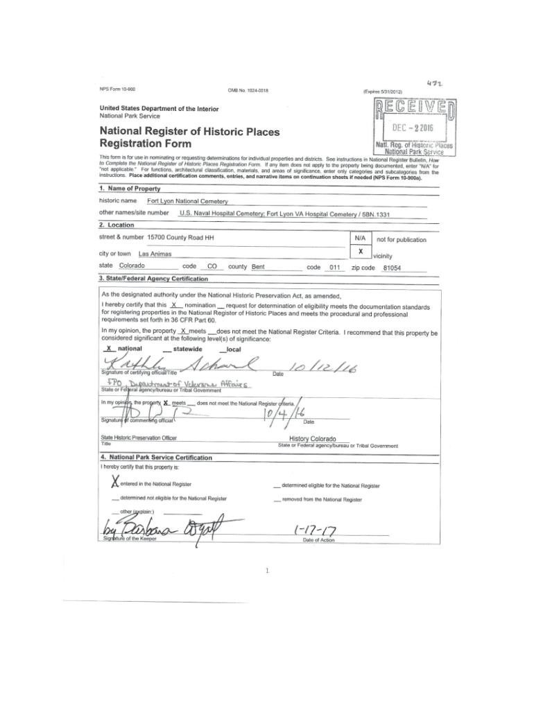 Get the free National Register Nomination Form. Fort Lyon National Cemetery