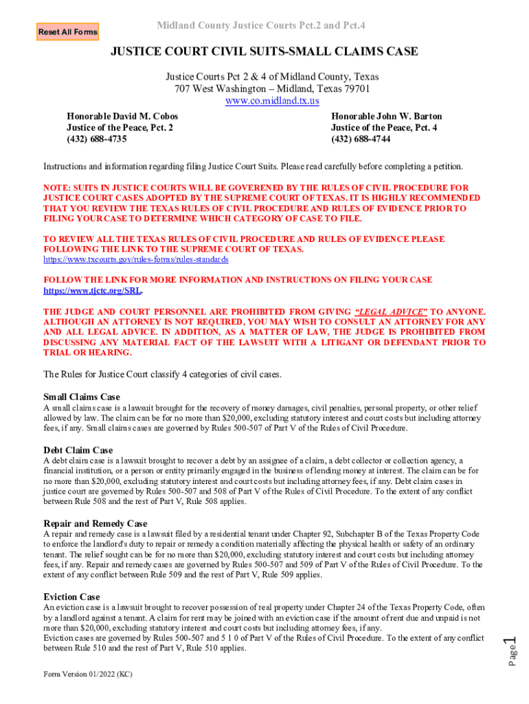 Midland County Justice Courts Pct.2 and Pct.4Reset All FormsJUSTICE COURT CIVIL SUITSSMALL CLAIMS CASE