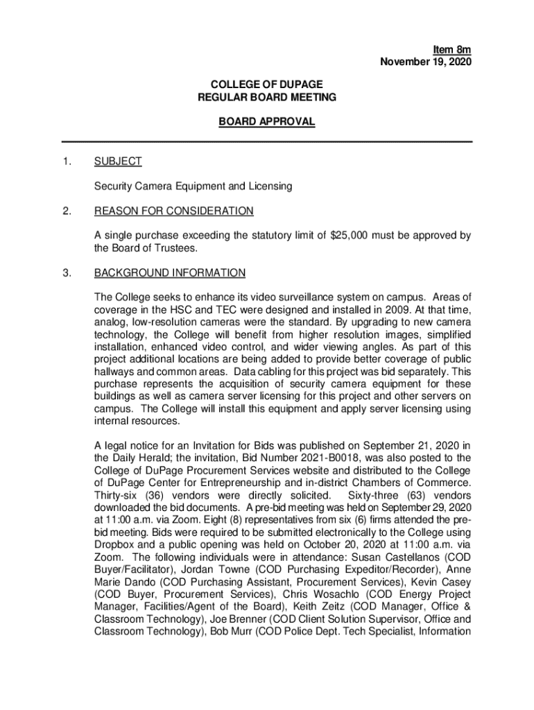 Item 8 m November 19, 2020, COLLEGE OF DUPAGE REGULAR BOARD MEETING BOARD APPROVAL1.SUBJECT Security Camera Equipment and Licensing2.REASON FOR CONSIDERATION A single purchase exceeding the statutory