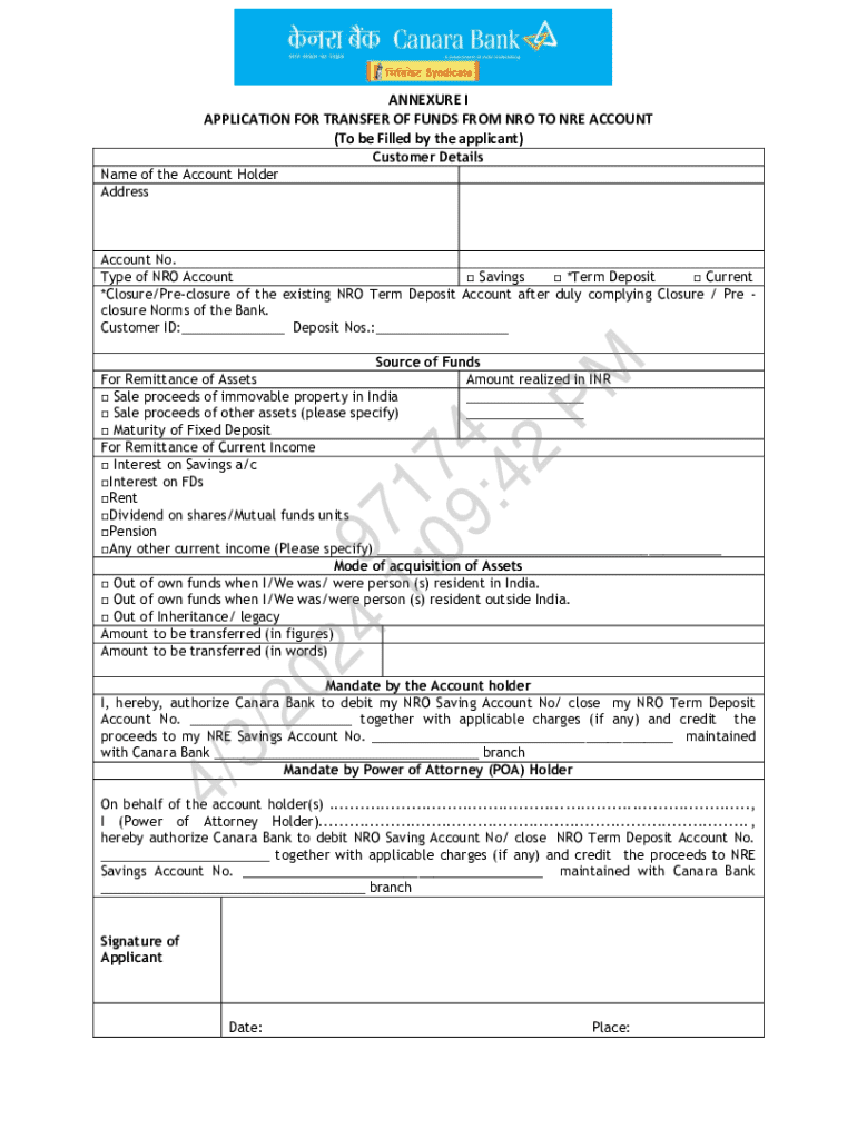 APPLICATION FOR TRANSFER OF FUNDS FROM NRO TO ARE ACCOUNT