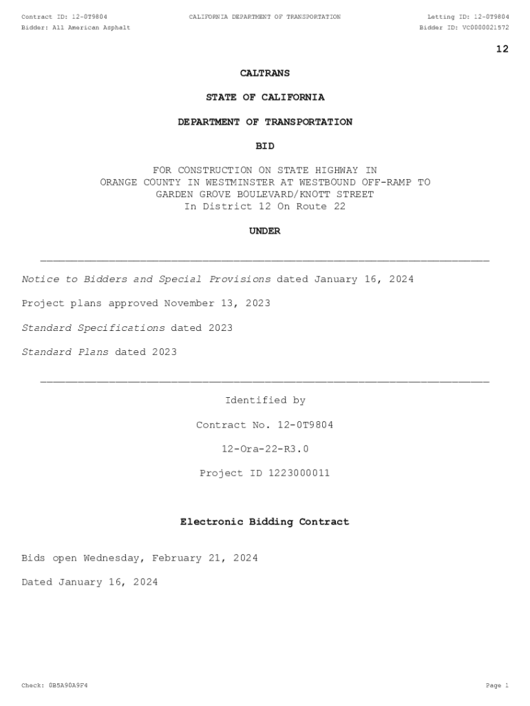 Contract ID: 120T9804CALIFORNIA DEPARTMENT OF TRANSPORTATIONBidder: All American AsphaltLetting ID: 120T9804