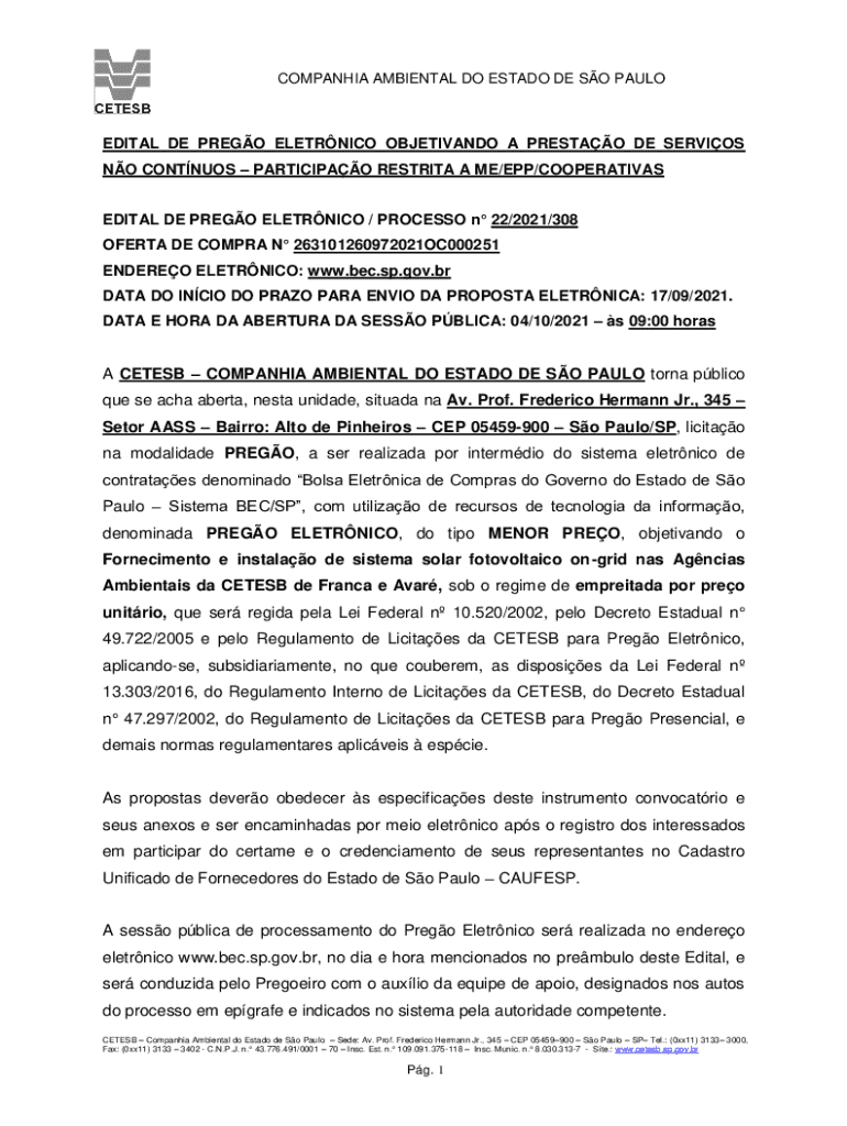 COMPANY AMBIENT AL DO ESTATE DE SO PAULOEDITAL DE PRESO ELECTRIC OBJETIVANDO A PRESTO DE SERVOS