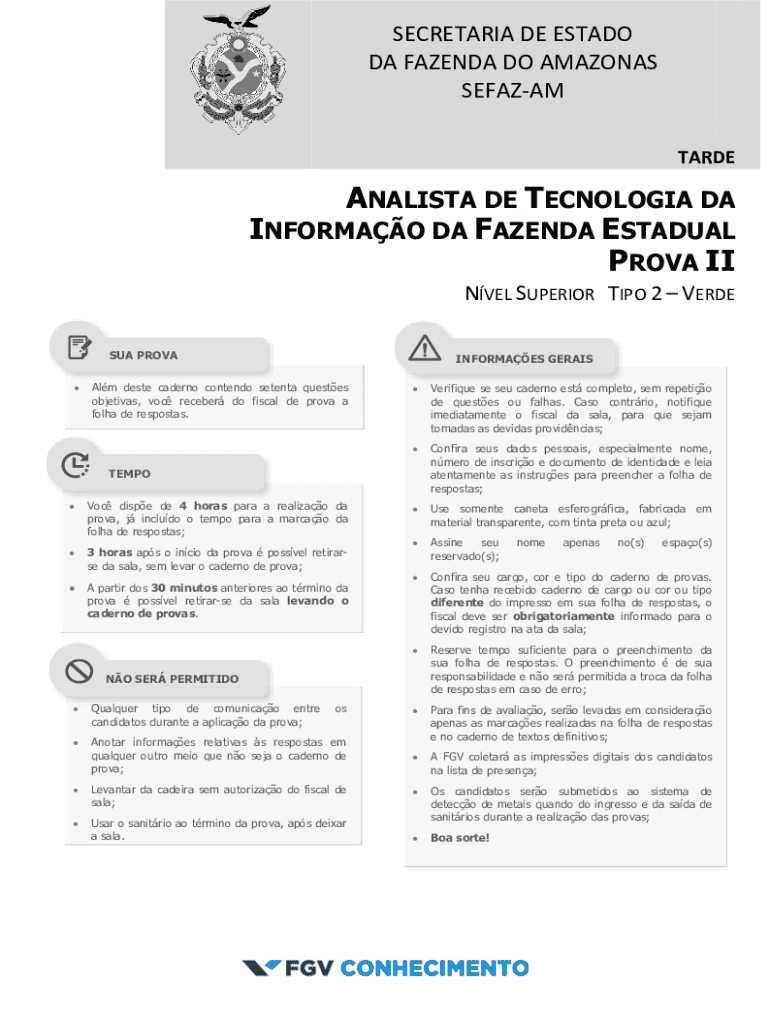 SECRETARIA DE ESTADO DA FAZENDA DO AMAZONAS SEFAZAM TARDEANALISTA DE TECNOLOGIA DA INFORMAO DA FAZENDA ESTADUAL PROVA II NVEL SUPERIOR TIPO 2 VERDE SUA PROVA INFORMAES GERAISAlm deste caderno contendo