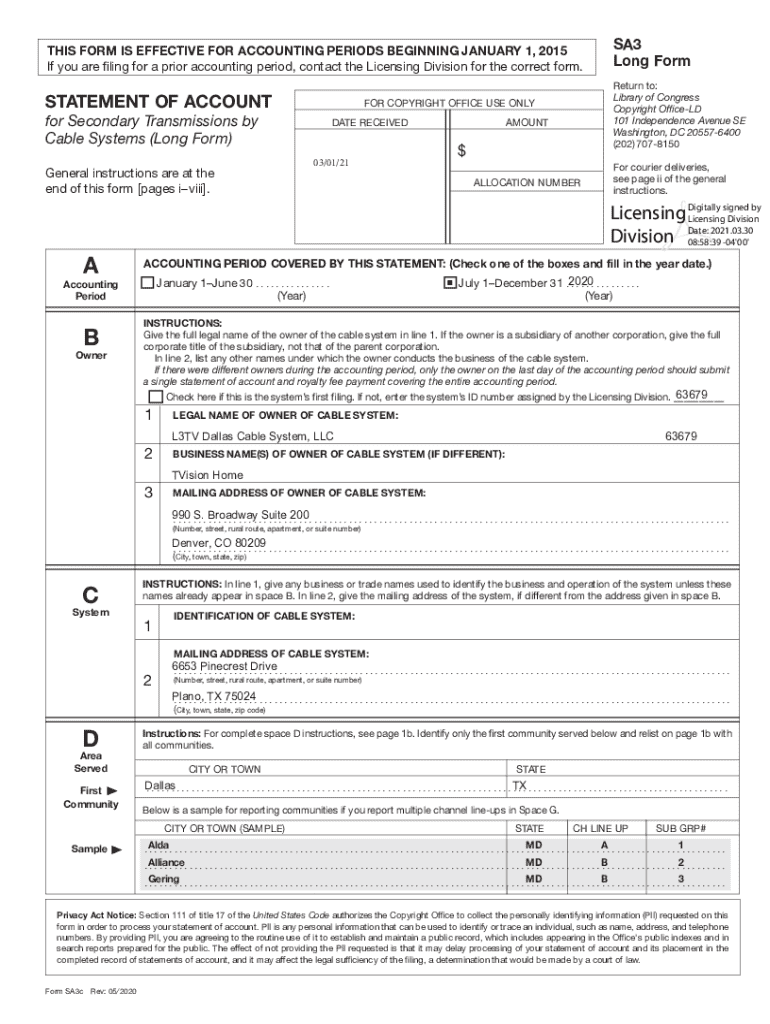 To fill out the L3TV Dallas Cable System, service providers need to complete the designated forms, providing detailed information about their services and operational compliance.