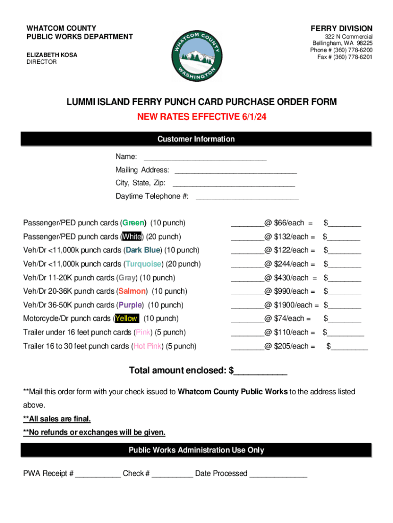 Get the free Whatcom County Ferry Punch Card Mail In Form, effective 6.1.24