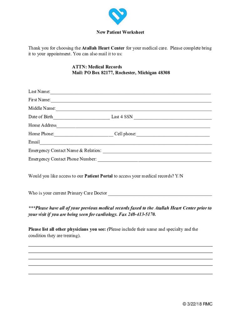 Get the free New Patient Worksheet Thank you for choosing the Atallah Heart ...