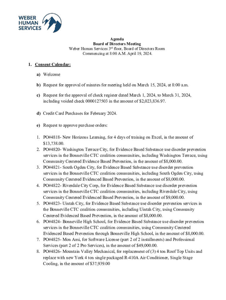 Agenda Board of Directors Meeting Weber Human Services 3rd floor, Board of Directors Room Commencing at 8:00 A.M. April 19, 2024.1. Consent Calendar: a) Welcome b) Request for approval of minutes