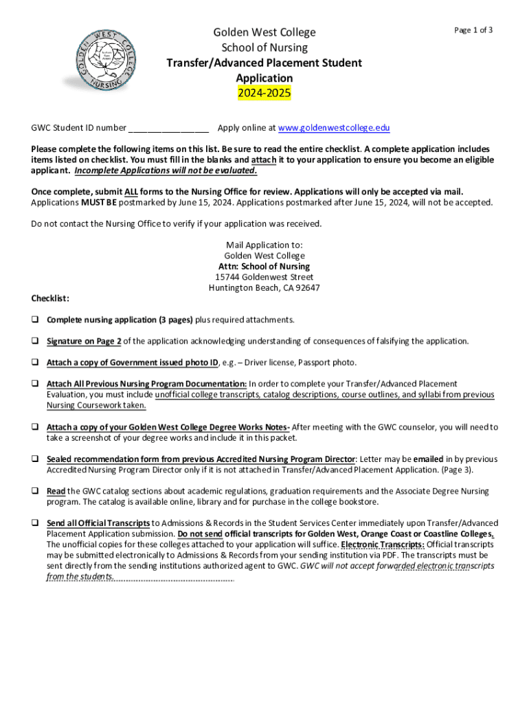 Get the free Golden West College School of Nursing Transfer/Advanced ...