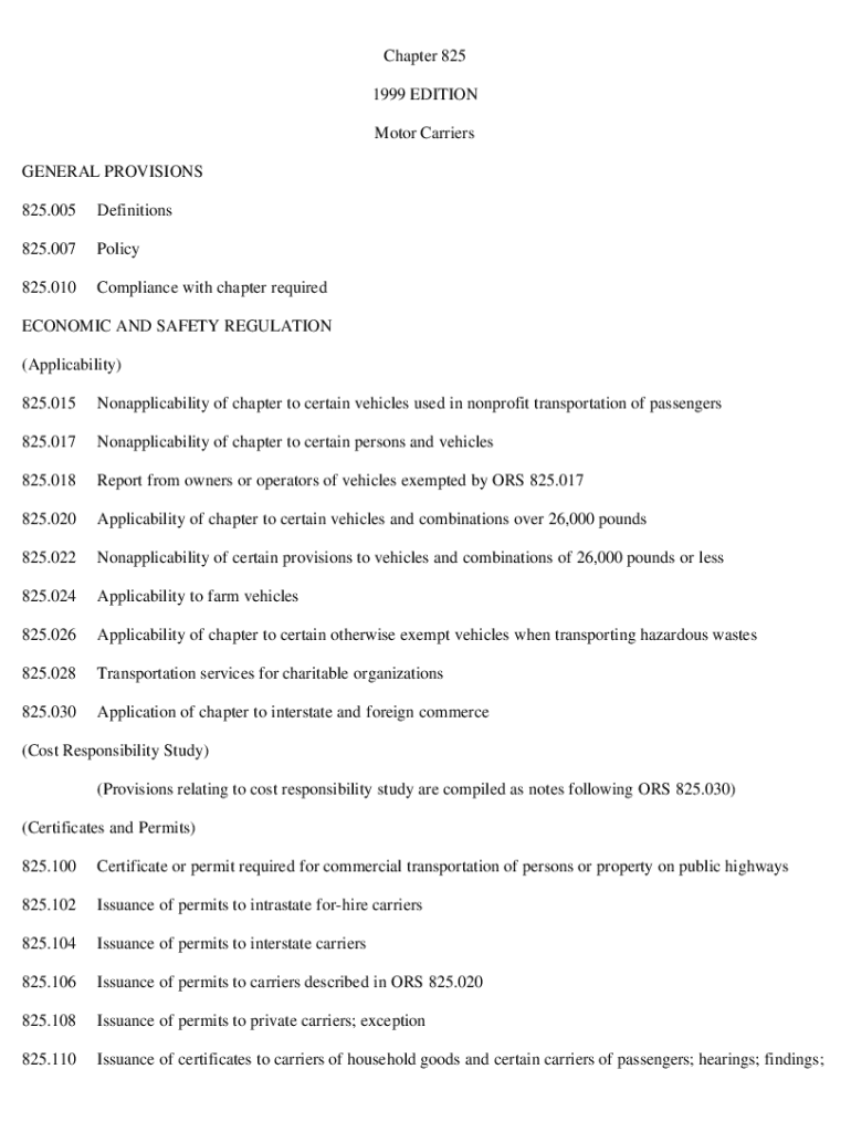 Chapter 825 1999 EDITION Motor Carriers GENERAL PROVISIONS 825.005 Definitions 825.007 Policy 825.010 Compliance with chapter required ECONOMIC AND SAFETY REGULATION (Applicability) 825.015 Nonapplicability