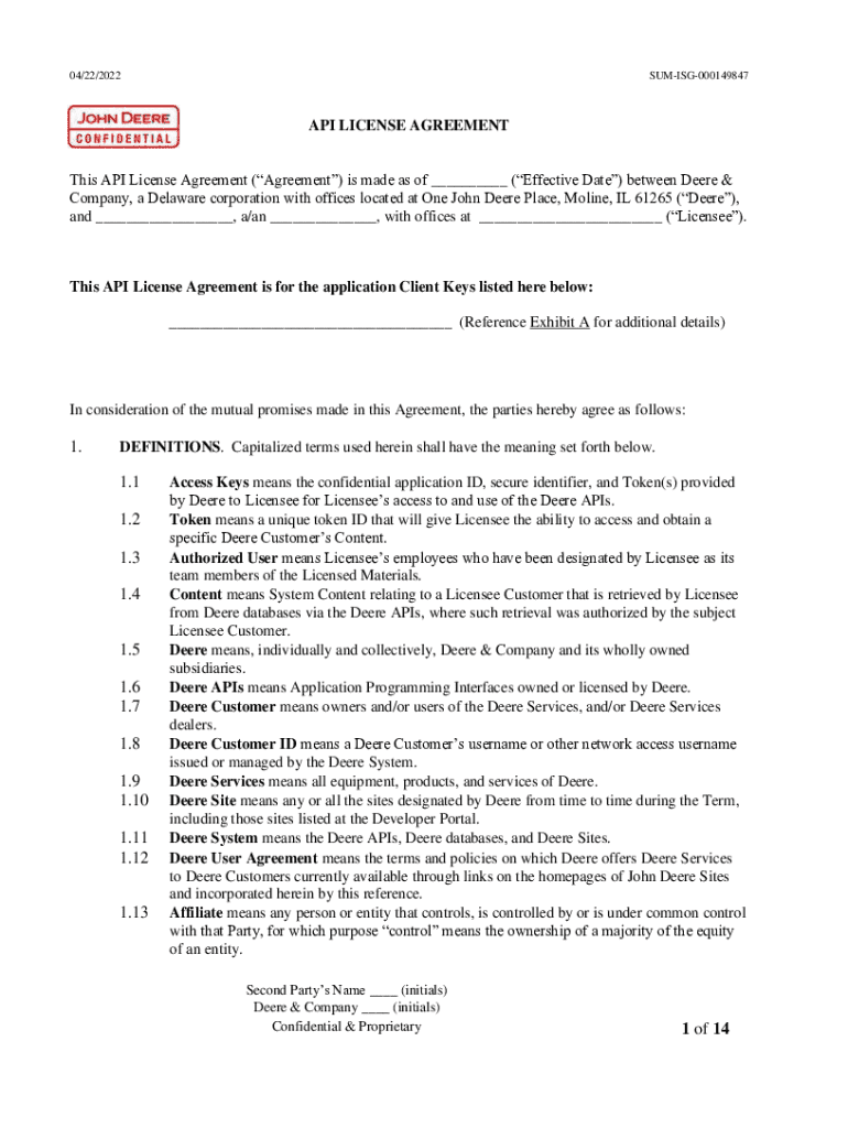 This API License Agreement (Agreement) is made as of ___ (Effective Date) between Deere &