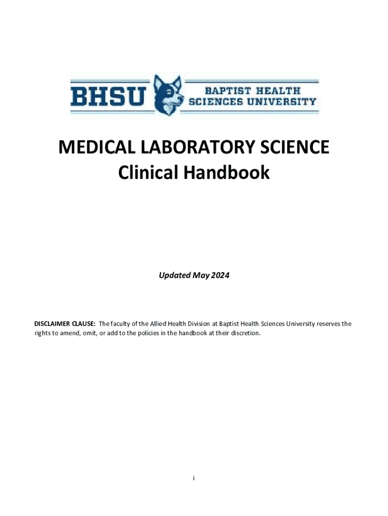 MEDICAL LABORATORY SCIENCE Clinical HandbookUpdated May 2024DISCLAIMER CLAUSE: The faculty of the Allied Health Division at Baptist Health Sciences University reserves the rights to amend, omit, or