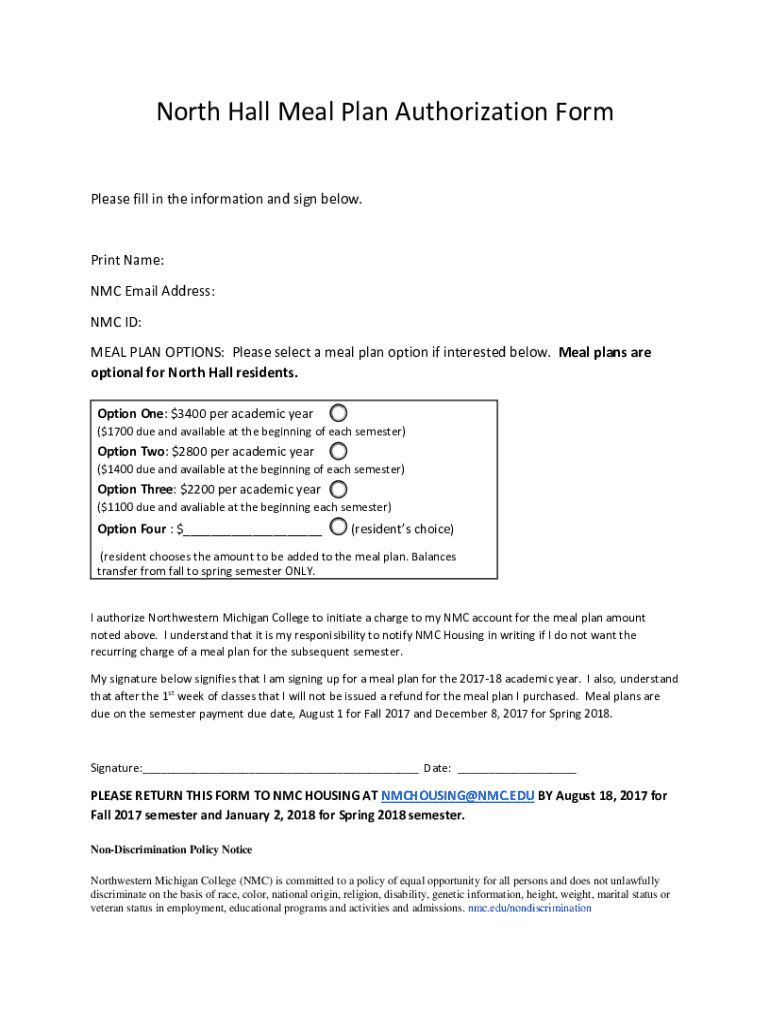 Get the free NMC North Hall Meal Plan Authorization Form. NMC North Hall Meal Plan Authorization ...