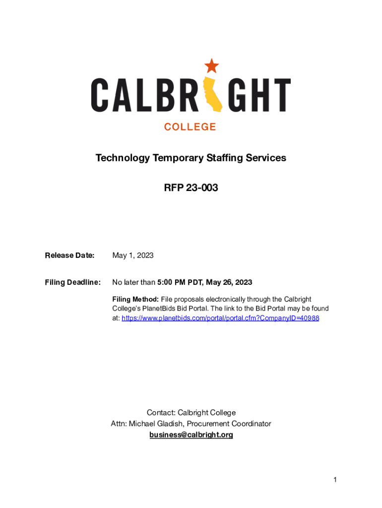 RFP 23003Release Date:May 1, 2023Filing Deadline:No later than 5:00 PM PDT, May 26, 2023,