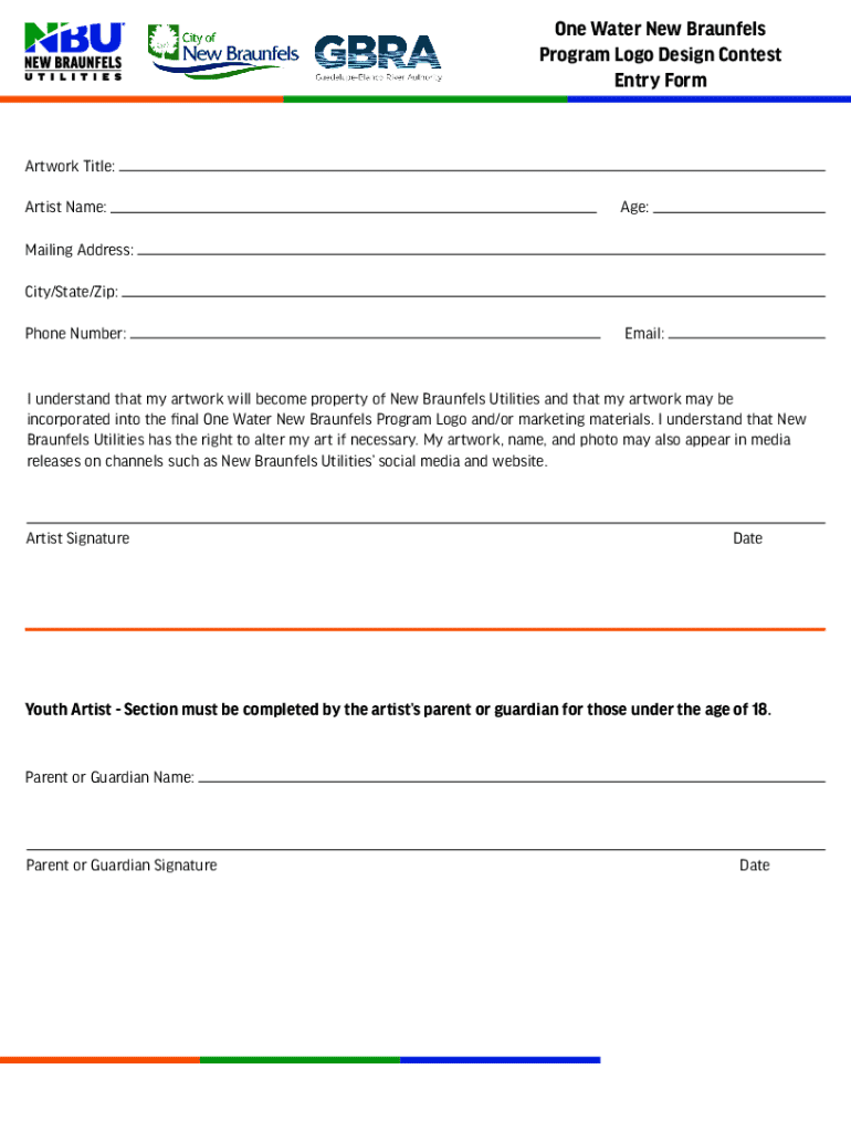One Water New Braunfels Program Logo Design Contest Entry FormArtwork Title: Artist Name:Age:Mailing Address: City/State/Zip: Phone Number:Email:I understand that my artwork will become property of