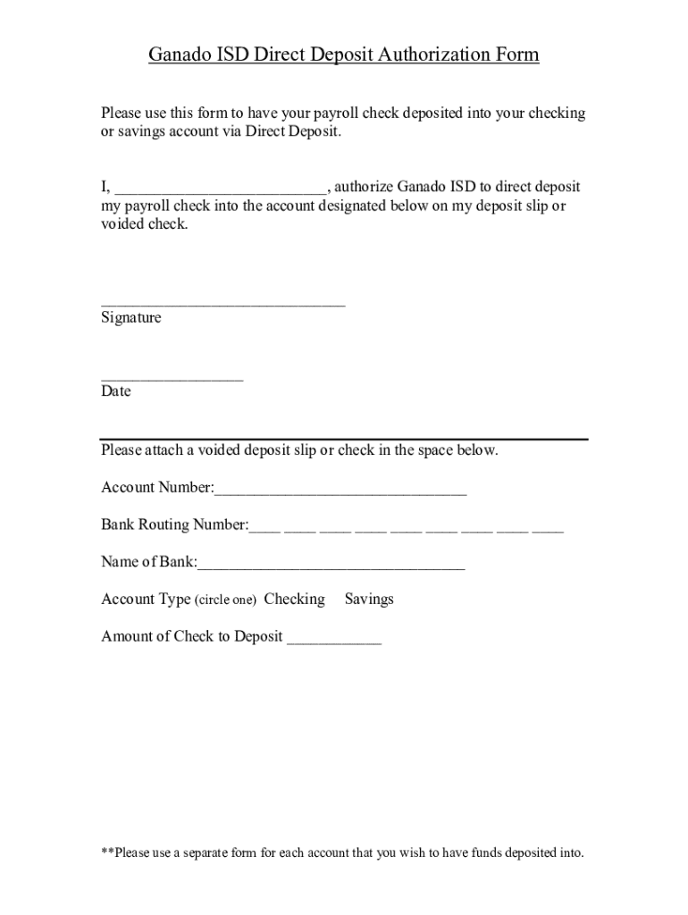 Ganado ISD Direct Deposit Authorization Form Please use this form to have your payroll check deposited into your checking or savings account via Direct Deposit. I, ___, authorize Ganado ISD to direct