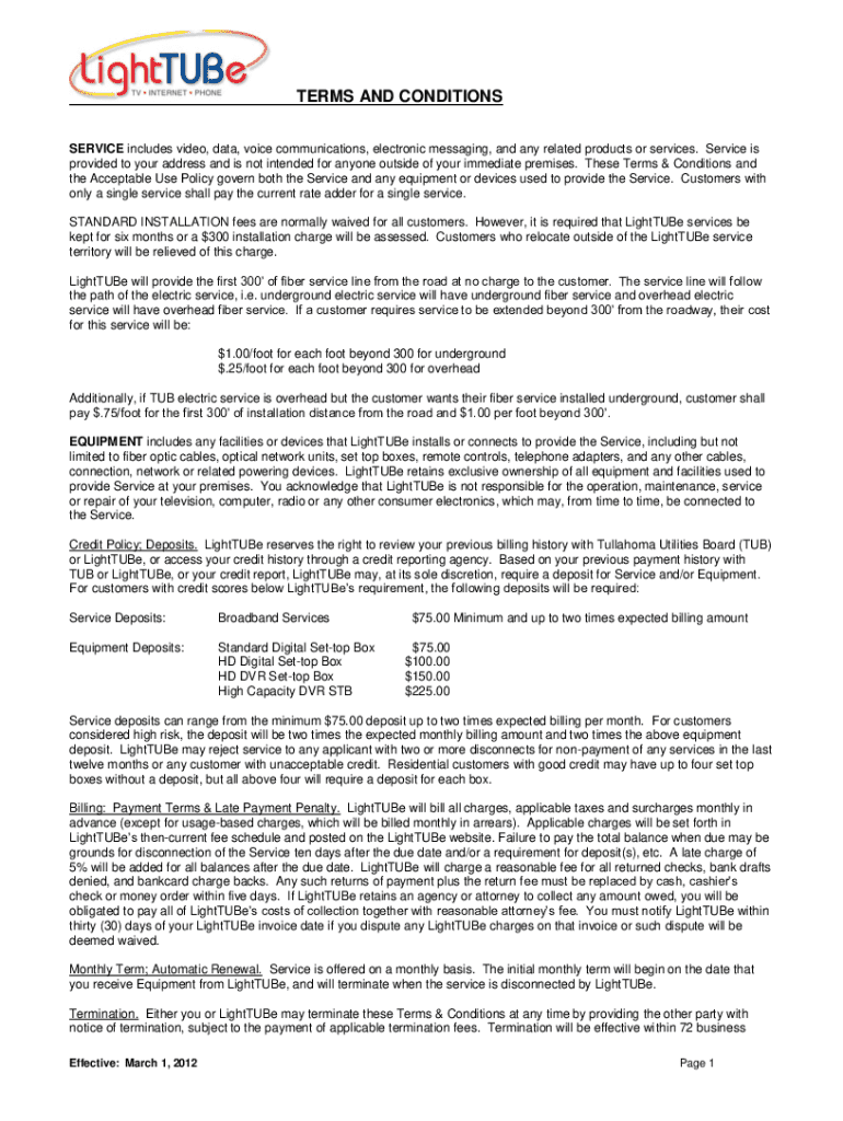 TERMS AND CONDITIONS SERVICE includes video, data, voice communications, electronic messaging, and any related products or services. Service is provided to your address and is not intended for anyone