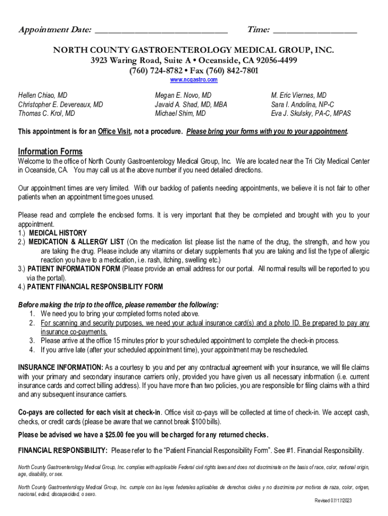 Appointment Date: ___Time: ___NORTH COUNTY GASTROENTEROLOGY MEDICAL GROUP, INC.