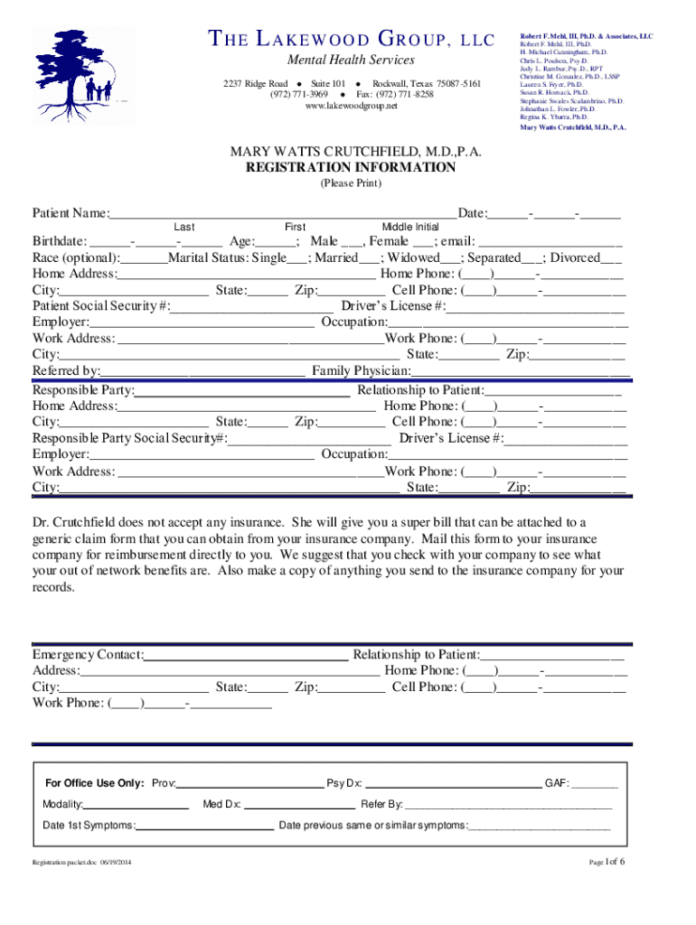 To fill out the Lakewood Group Mental Health forms, patients typically need to provide personal information, insurance details, medical history, and reasons for seeking treatment.
