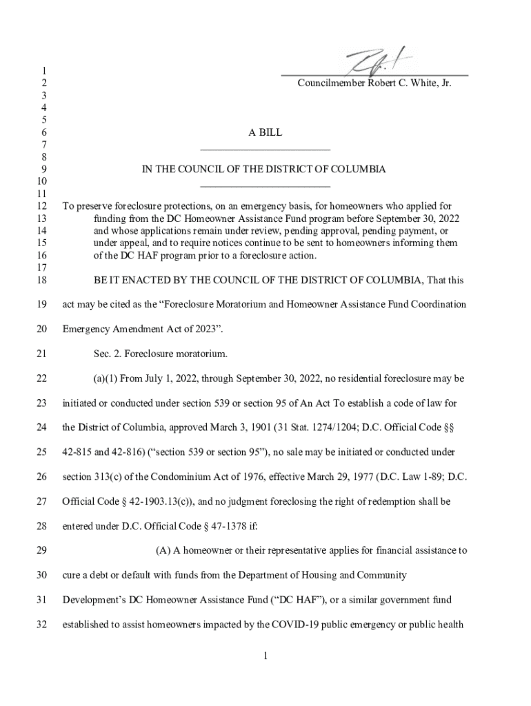 1 2 3 4 5 6 7 8 9 10 11 12 13 14 15 16 17 18Councilmember Robert C. White, Jr.A BILL ___ IN THE COUNCIL OF THE DISTRICT OF COLUMBIA ___ To preserve foreclosure protections, on an emergency basis,