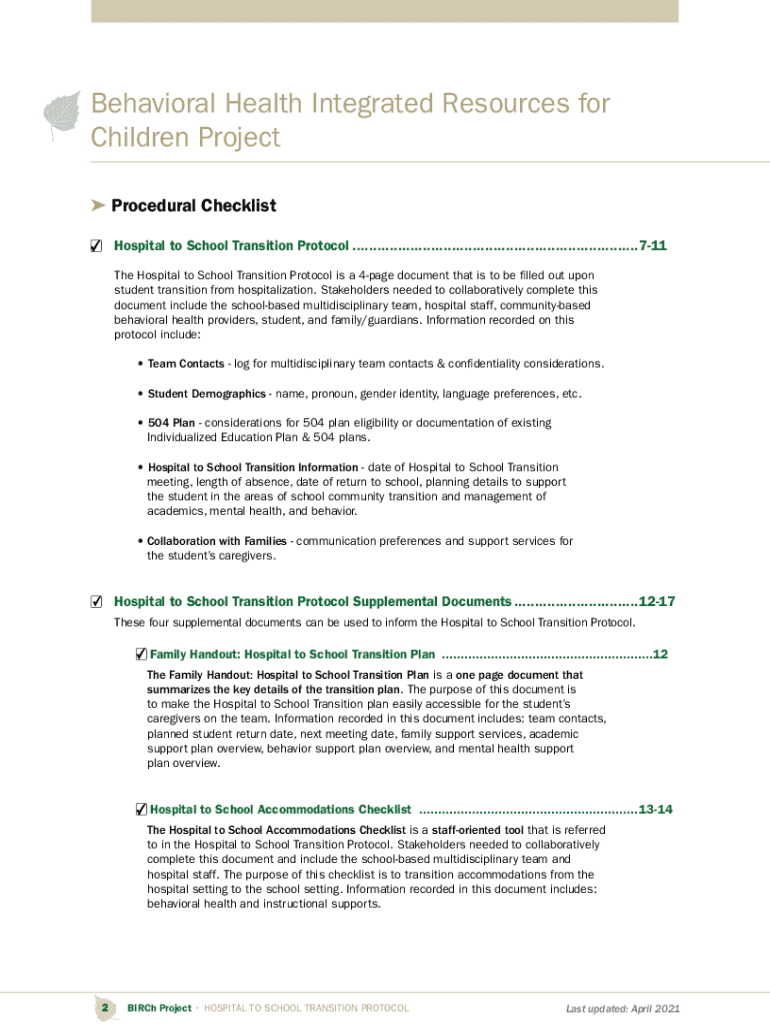Proje h C R ct I BHospital to School Transition Protocol This protocol was developed by the Behavioral health Integrated Resources for Children Project (BIRCh), representing a collaboration between