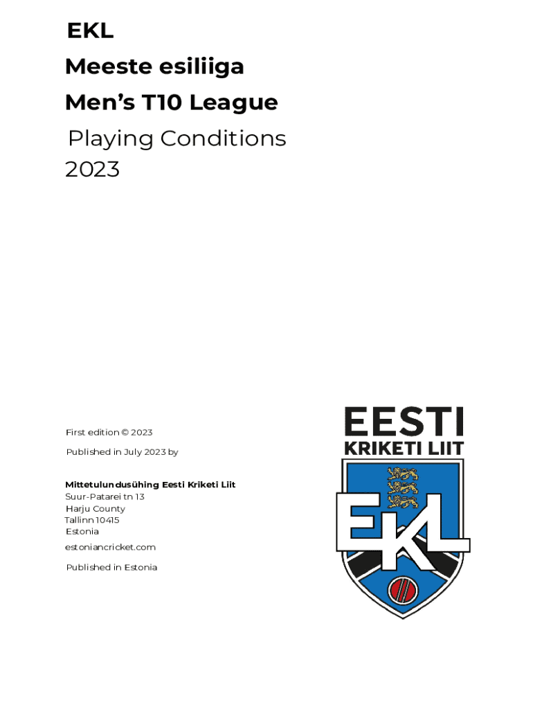 EKL Meeste esiliiga Mens T10 League Playing Conditions 2023First edition 2023 Published in July 2023 byMittetulundushing Eesti Kriketi Liit SuurPatarei tn 13 Harju County Tallinn 10415 Estonia estoniancricket.com