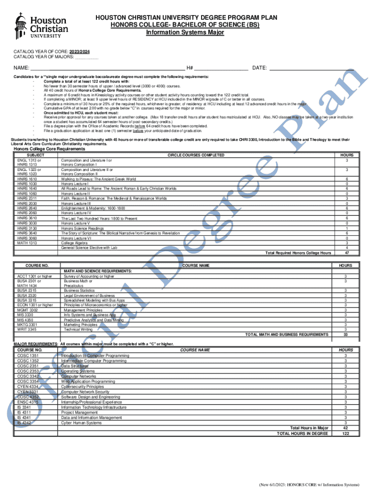 HOUSTON CHRISTIAN UNIVERSITY DEGREE PROGRAM PLAN HONORS COLLEGE BACHELOR OF SCIENCE (BS) Information Systems Major CATALOG YEAR OF CORE: 2023/2024 CATALOG YEAR OF MAJORS: ___NAME: ___H# ___ DATE:Candidates