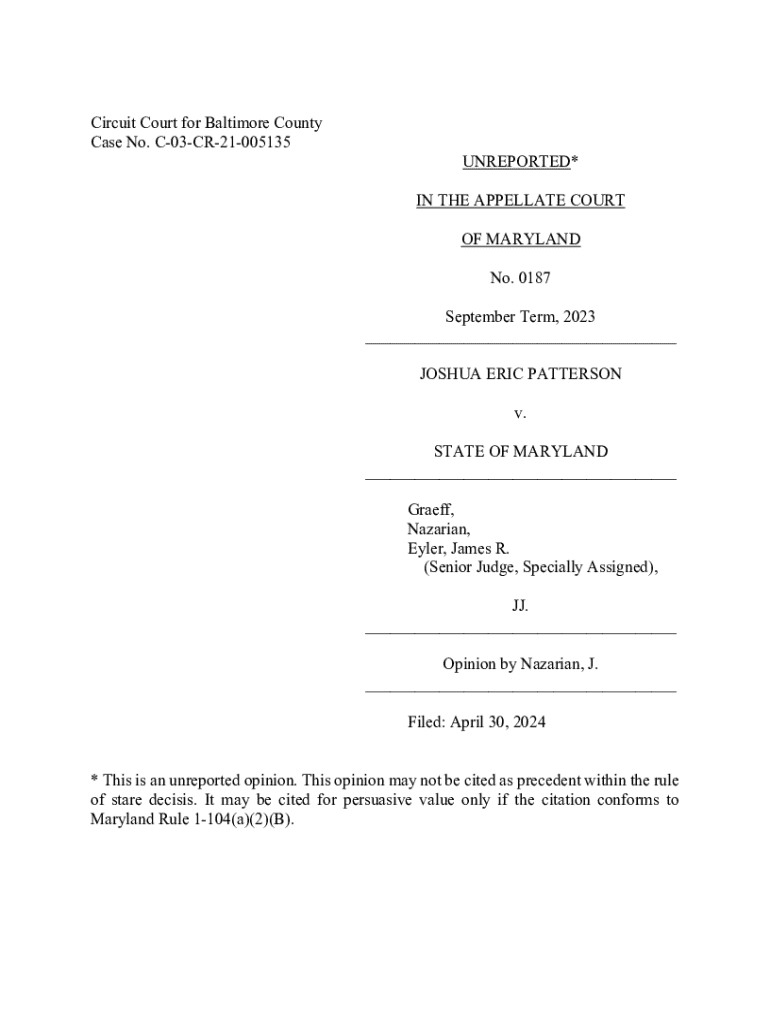 Circuit Court for Baltimore County Case No. C03CR21005135UNREPORTED* IN THE APPELLATE COURT OF MARYLAND No. 0187 September Term, 2023 ___ JOSHUA ERIC PATTERSON v. STATE OF MARYLAND ___ Graeff, Nazarian,