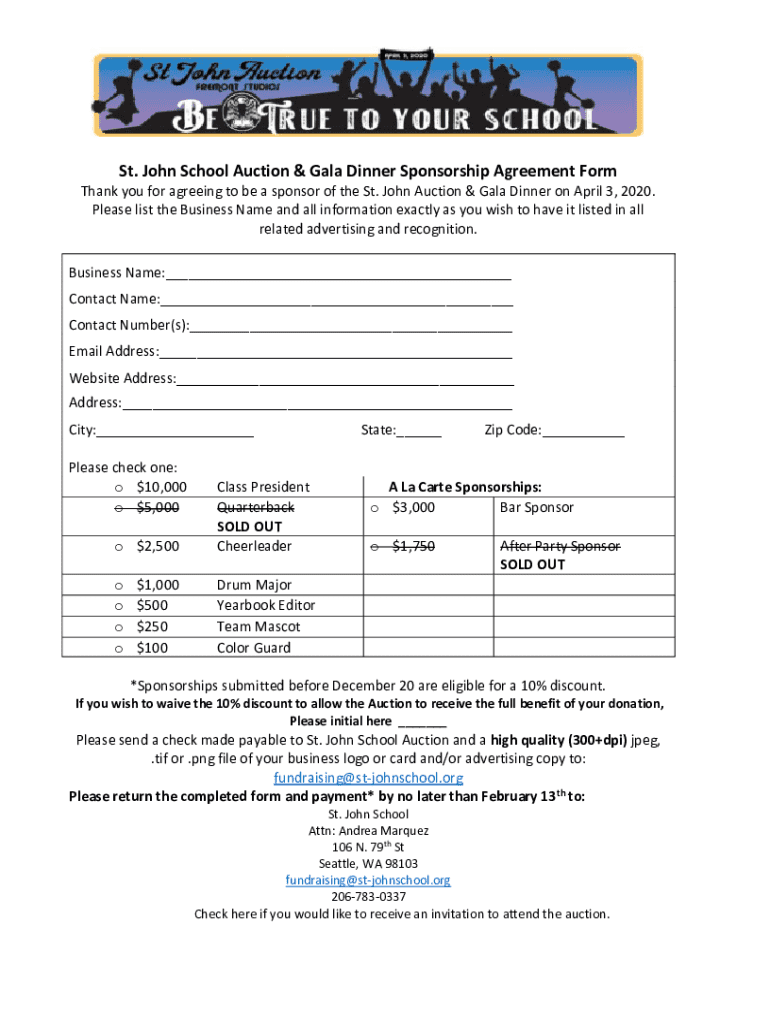 St. John School Auction & Gala Dinner Sponsorship Agreement Firsthand you for agreeing to be a sponsor of the St. John Auction & Gala Dinner on April 3, 2020.