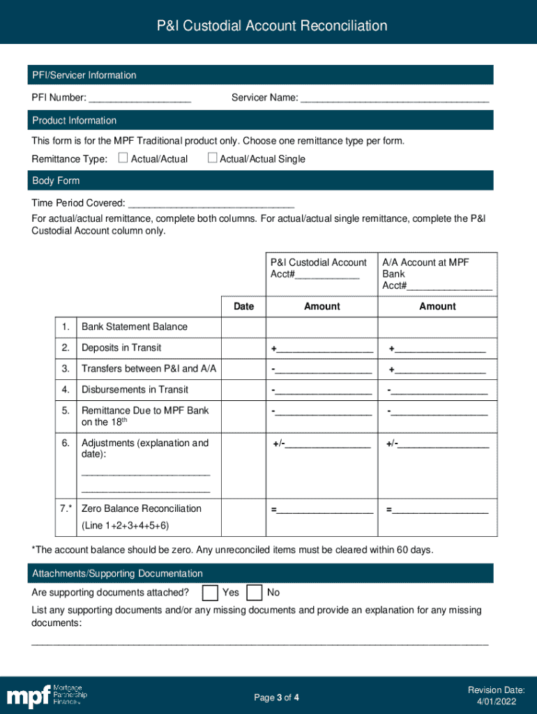 P&I Custodial Account Reconciliation Form SG320A Instructions Page Purpose Servicers of MPF Traditional loans servicing under the actual/actual or actual/actual single remittance type must use this
