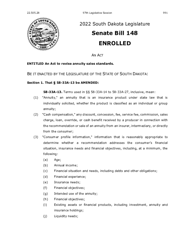 22.505.2897th Legislative Session9912022 South Dakota Legislature Senate Bill 148 ENROLLED AN ACT ENTITLED An Act to revise annuity sales standards.BE IT ENACTED BY THE LEGISLATURE OF THE STATE OF