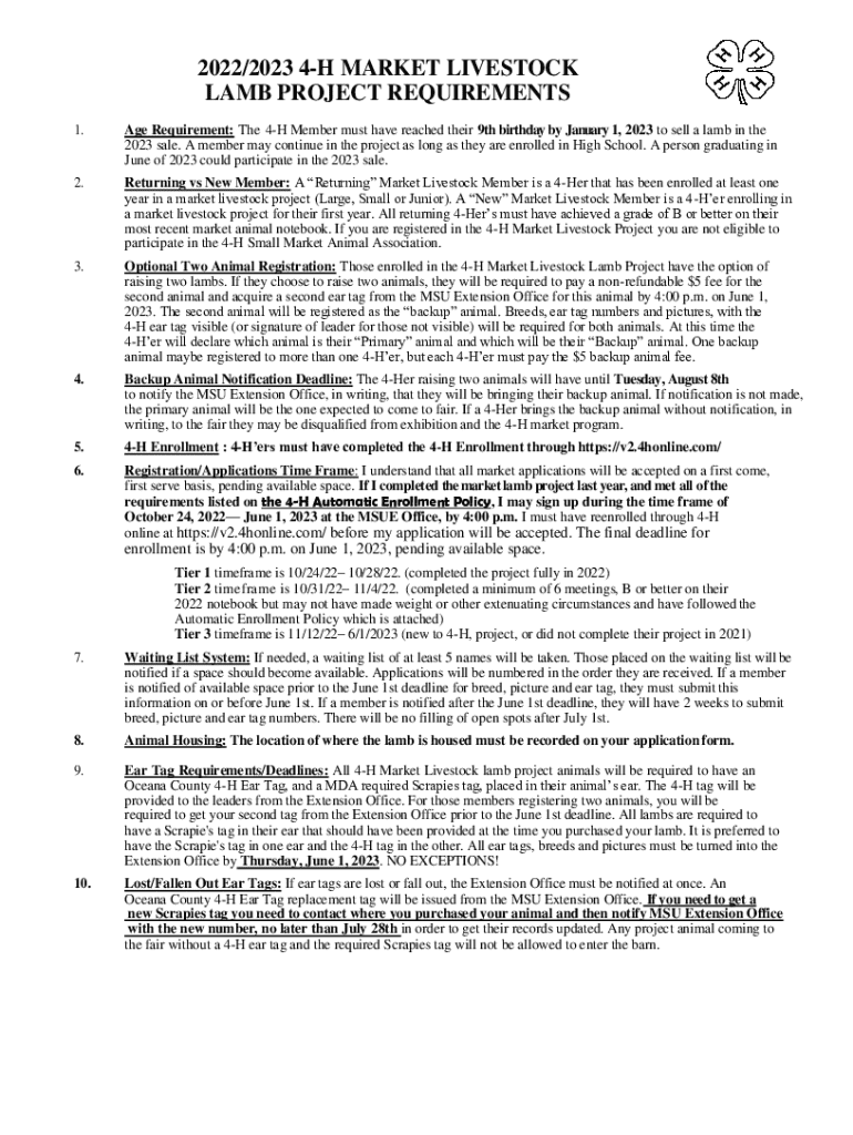 2022/2023 4H MARKET LIVESTOCK LAMB PROJECT REQUIREMENTS 1. Age Requirement: The 4H Member must have reached their 9th birthday by January 1, 2023, to sell a lamb in the 2023 sale. A member may continue
