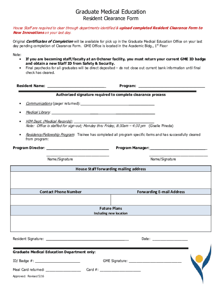 Graduate Medical Education Resident Clearance Form House Staff are required to clear through departments identified & upload completed Resident Clearance Form to New Innovations on your last day.