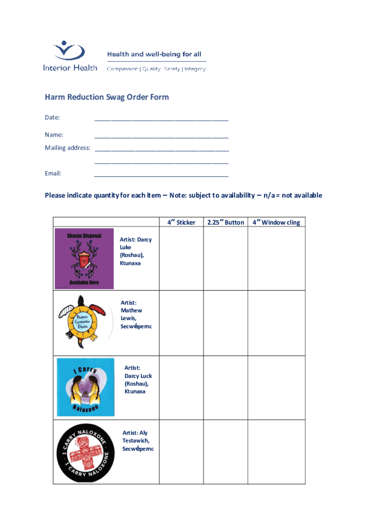 Harm Reduction Swag Order Form Date:___Name:___Mailing address: ___ ___ Email:___Please indicate quantity for each item Note: subject to availability n/a not available4 Sticker Artist: Darcy Luke