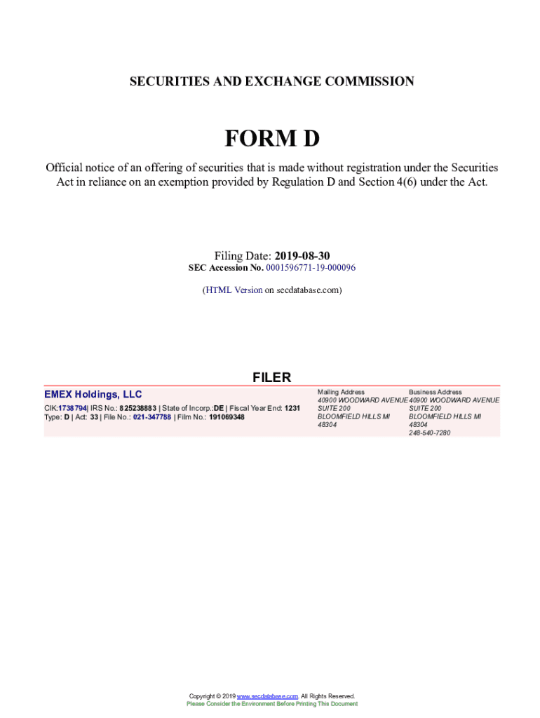 Get the free EMEX Holdings, LLC Form D Filed 2019-08-30. Accession Number