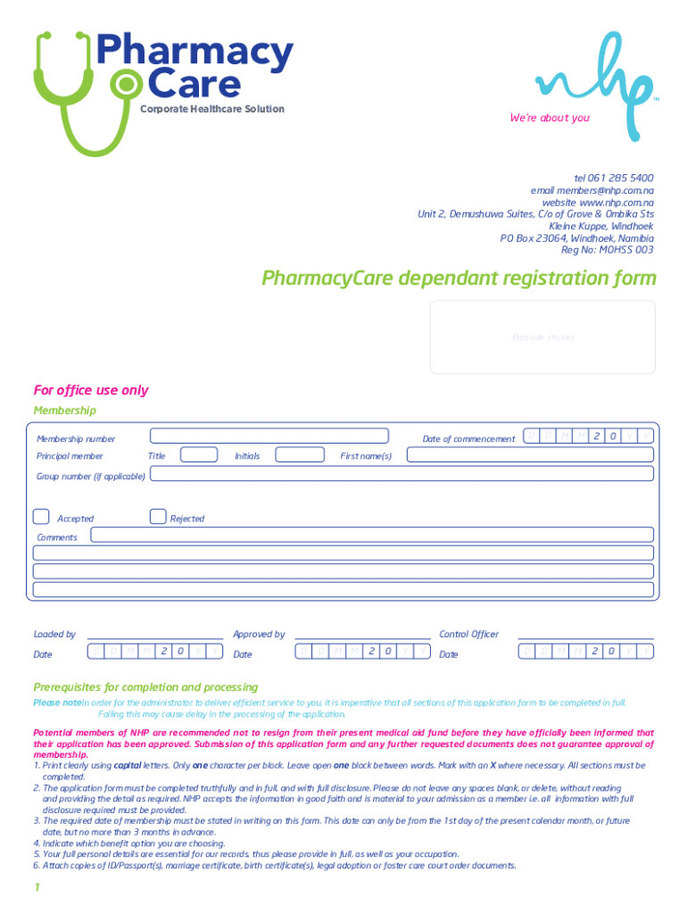 Pharmacy Care Corporate Healthcare SolutionWere about youDependant registrationMembership application form Confidential Confidential teltel 061 061285 2855400 5400email members@nhp.com.na faxtel 061