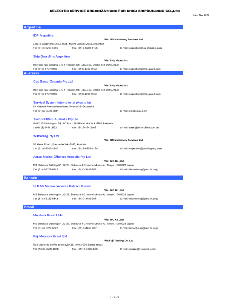 SELECTED SERVICE ORGANIZATIONS FOR SHIGI SHIPBUILDING CO.,LTD DateNov 2020Argentina IDP Argentina Via: ISS Machinery Services Ltd Jose e. Colpmbres,2353 1605, Munro Buenos Aires, Argentina Tel: (81)