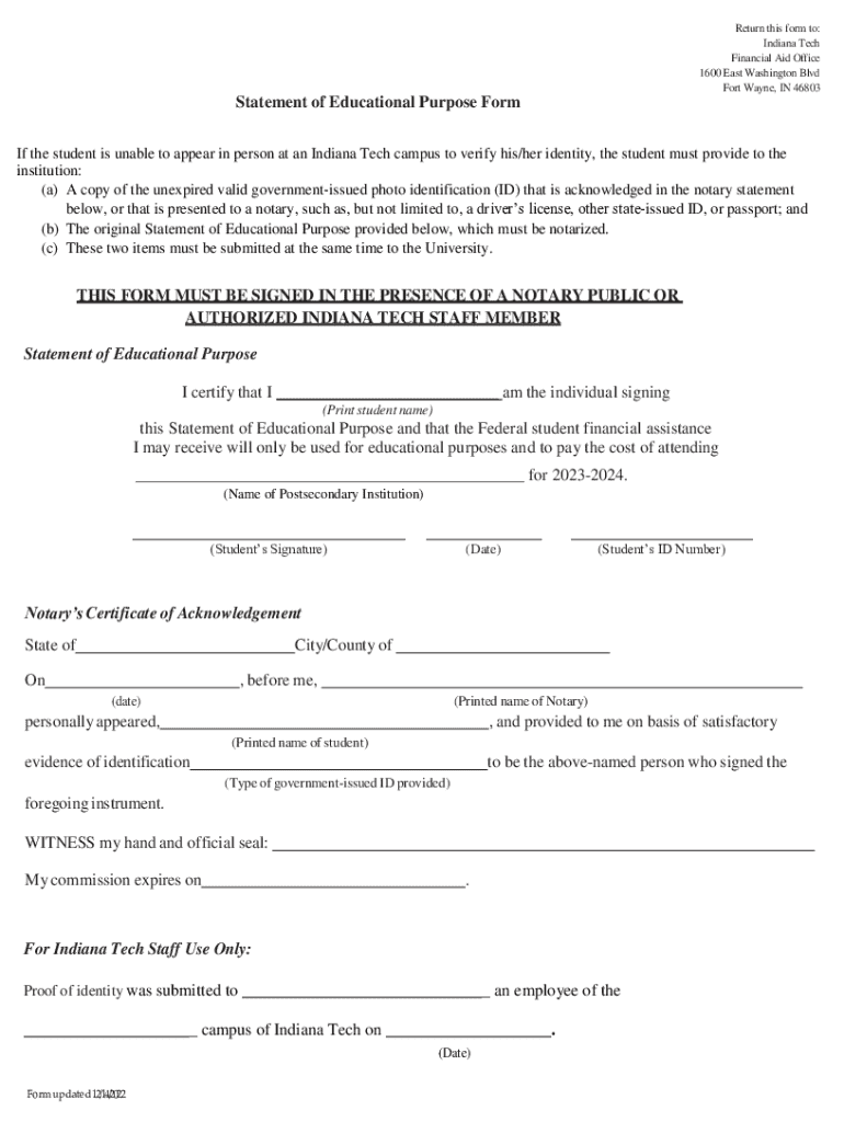 Return this form to: Indiana Tech Financial Aid Office 1600 East Washington Blvd Fort Wayne, IN 46803Statement of Educational Purpose Form If the student is unable to appear in person at an Indiana