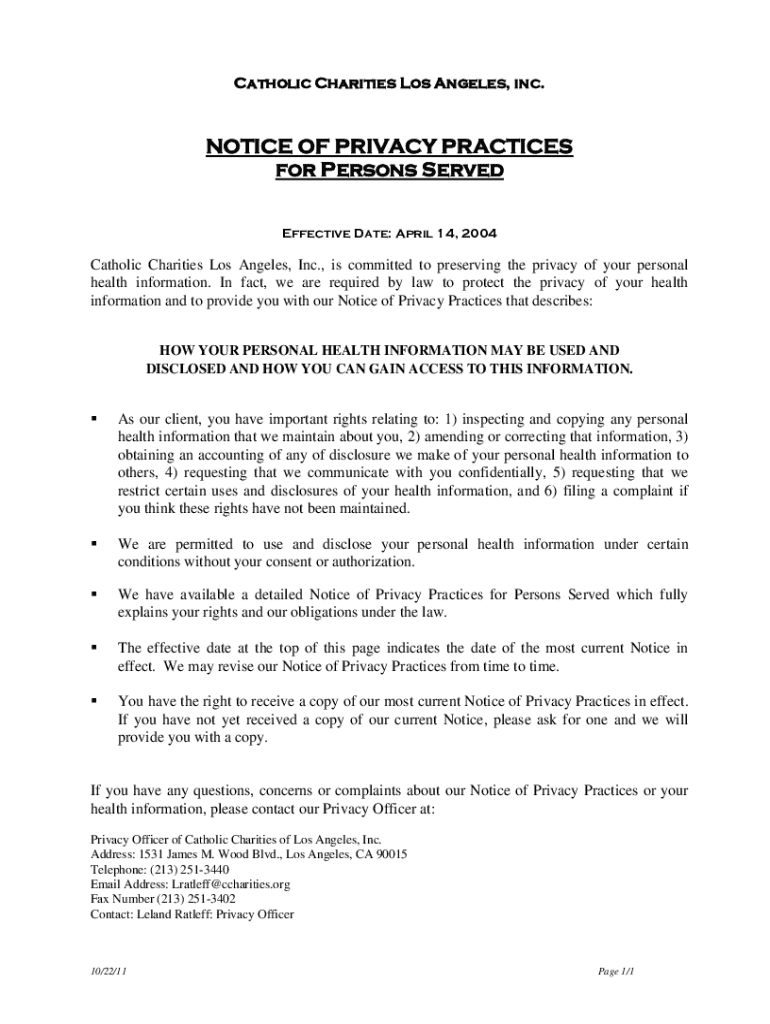 Effective Date: April 14, 2004Catholic Charities Los Angeles, Inc., is committed to preserving the privacy of your