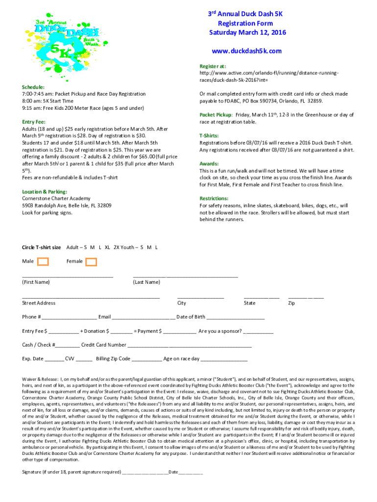 Fill out your duck dash 5k runwalk online with pdfFiller!