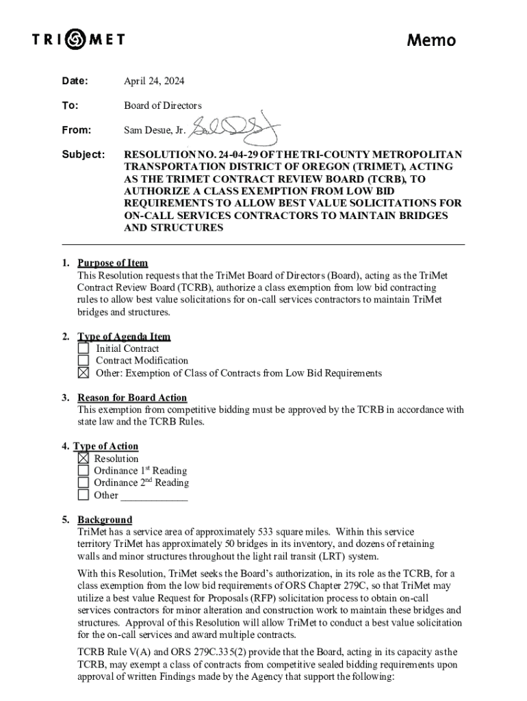 Date:April 24, 2024To:Board of DirectorsFrom:Sam Desue, Jr.Subject:RESOLUTION NO. 240429 OF THE TRICOUNTY METROPOLITAN TRANSPORTATION DISTRICT OF OREGON (TRIMET), ACTING AS THE TRIMET CONTRACT REVIEW