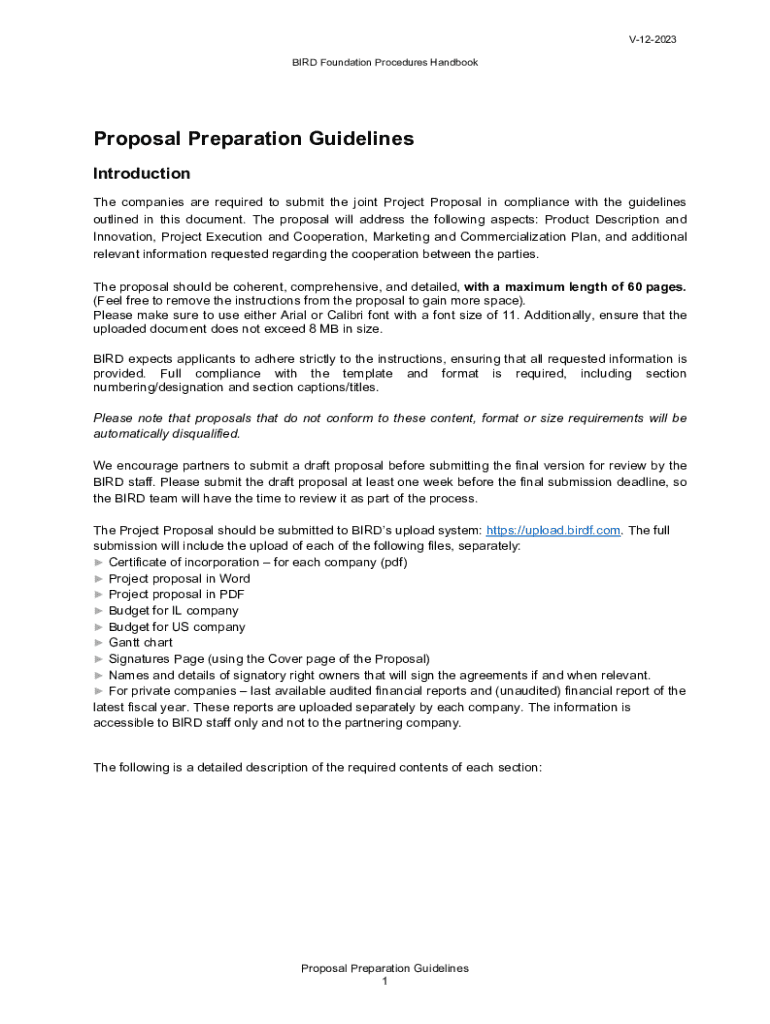 V122023 BIRD Foundation Procedures HandbookProposal Preparation Guidelines Introduction The companies are required to submit the joint Project Proposal in compliance with the guidelines outlined in