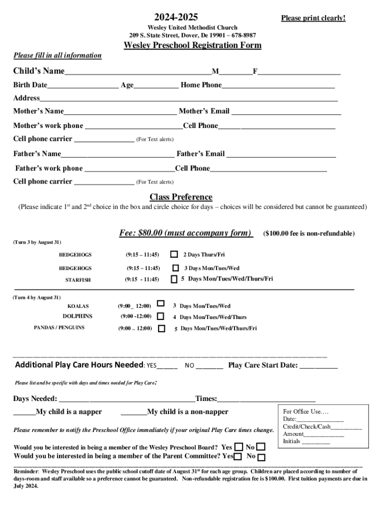 Parents or legal guardians of children who wish to enroll in Wesley Preschool need to fill out the registration form.