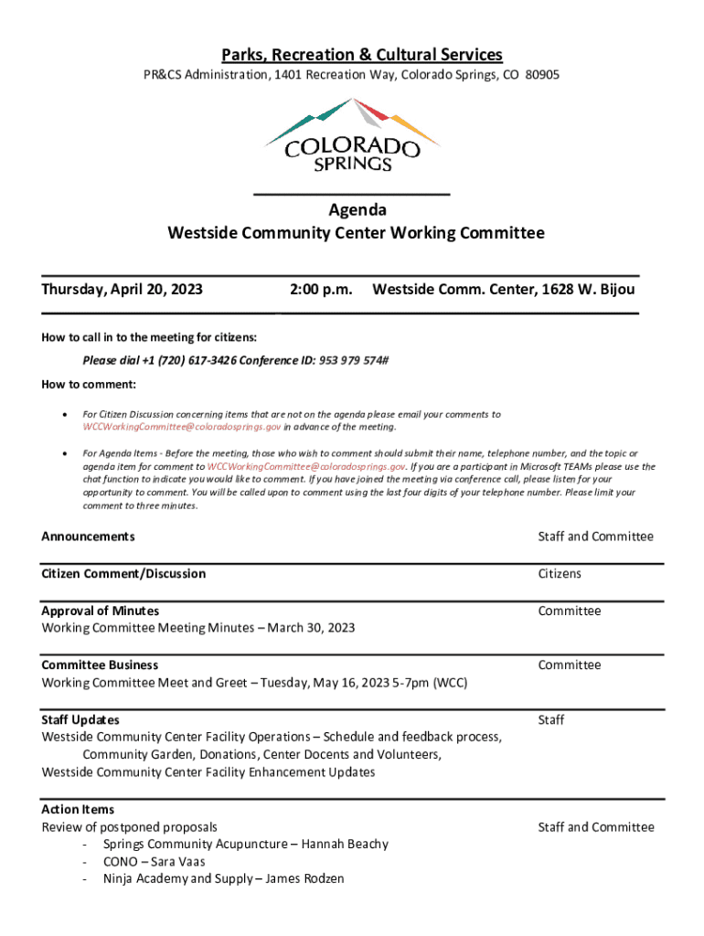 Parks, Recreation & Cultural ServicesPR&CS Administration, 1401 Recreation Way, Colorado Springs, CO 80905Agenda