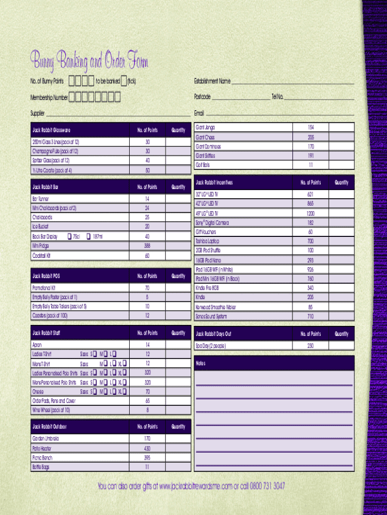 Bunny Banking and Order Form to be banked No. Of Bunny Points Establishment Name ___(tick)Postcode ___ Tel No. ___Membership NumberSupplier ___ Email ___ Jack Rabbit Glassware No. Of Points250ml Glass