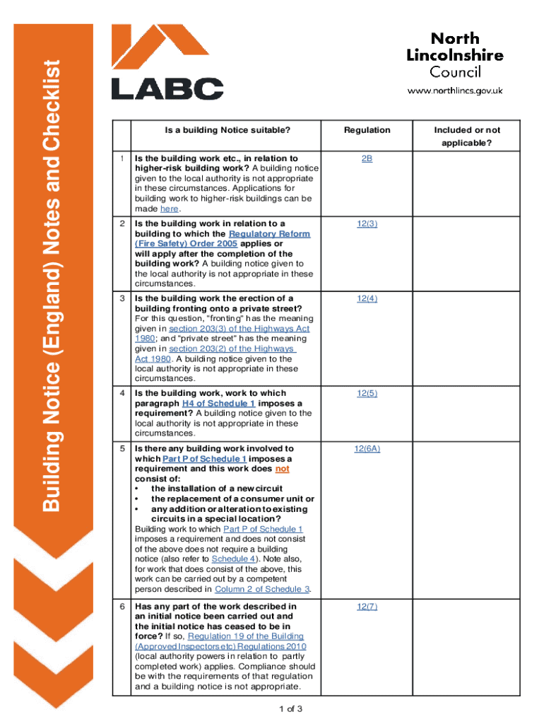 Building Notice (England) Notes and ChecklistIs a building Notice suitable?RegulationIncluded or not applicable?1Is the building work etc., in relation to higherrisk building work? A building notice
